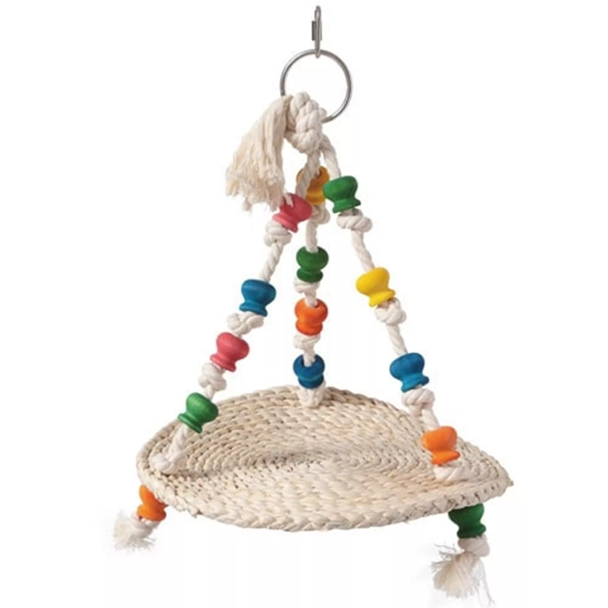 Vogels hebben van nature behoefte aan beweging, uitdaging en afwisseling. De Cereal Schommel Mat biedt precies dat. Het gevlochten zitvlak nodigt uit om te rusten, terwijl de katoenen touwen met houten elementen zorgen voor speel- en klimplezier.